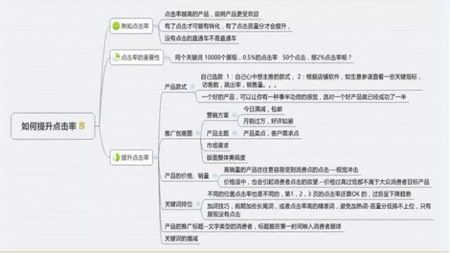 实在,实在,实在,实在的给大家做一个思维导图,我就不一一去说点击率的影响因素了,因为每一个类目都一样,如果我说的太虚,大家会觉得我更加不实在的。所以大家看思维导图,然后结合自己的类目跟产品去提升你的点击率!