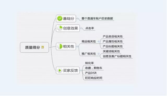 那么接下来说的就是直通车了,那么说起直通车大家都会很关心,因为都是淘宝唯一精准流量跟快速流量来源的渠道,做的好飞黄腾达,做不好倾家荡产。相信大家都会这么理解的,那么我们以下就跟大家也做了思维导图,让大家了解质量得分的提升丶点击率如何提升(转化率第四步会给大家详细的解说!)